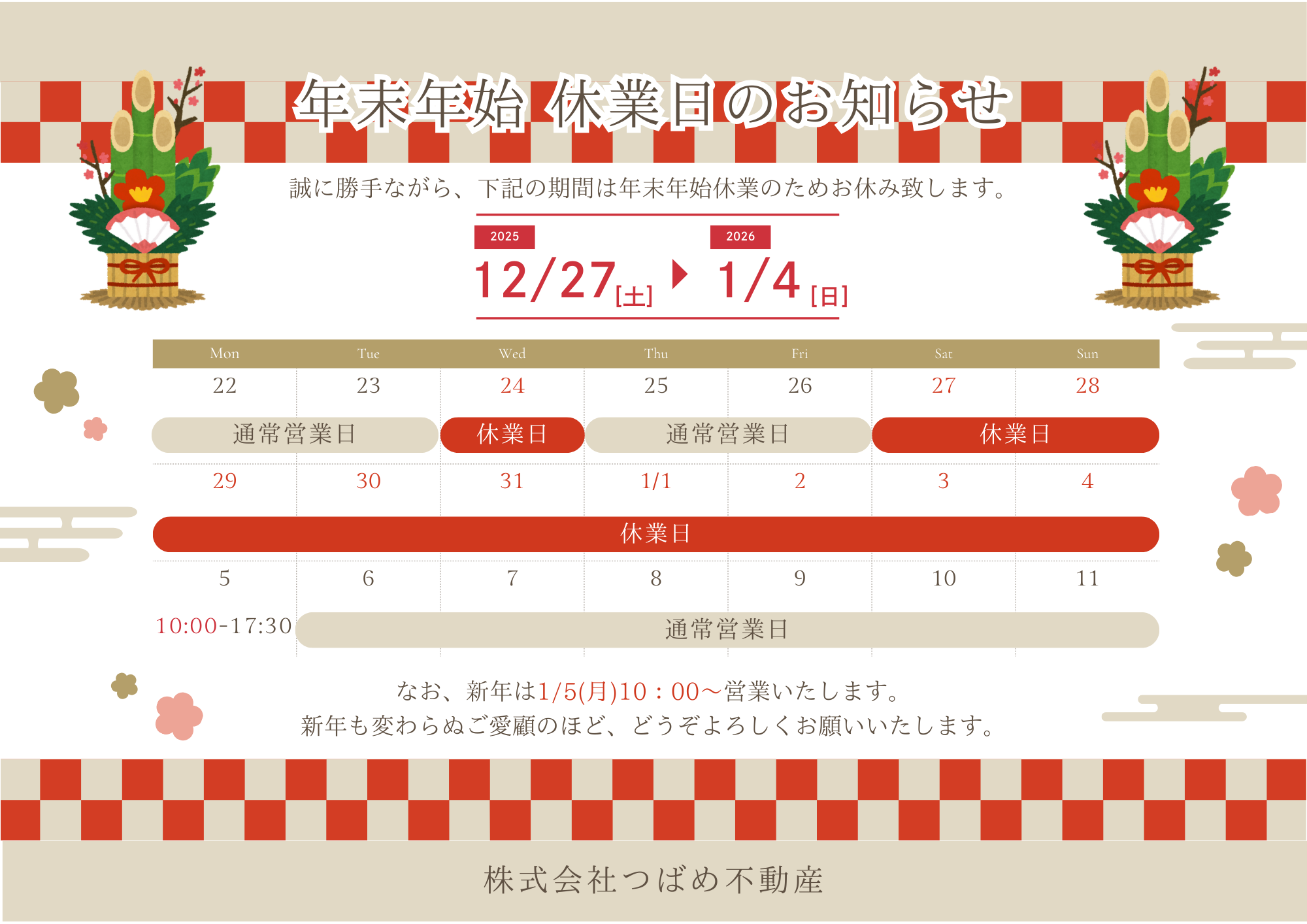 年末年始の休業日:2025年12月27日(土)~2026年1月4日(日)