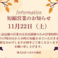 誠に勝手ながら、下記営業日を短縮営業とさせていただきますので、ご案内申し上げます。ご不便をおかけいたしますが、何卒ご了承いただきますようお願い申し上げます。短縮営業日:2025年11月22日(土)
